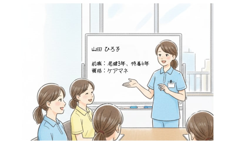「〇〇と申します。前職は老健で3年介護職として働き、リハビリ補助も経験しました。よろしくお願いします」