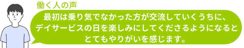 介護度が低いご利用者が多いので、未経験でもチャレンジしやすく、介護スキルや高齢者とのコミュニケーションスキルを徐々に高めていくことができるでしょう。夜勤がなく、固定休も取りやすいので、仕事とプライベートを両立しやすいのも特徴です。