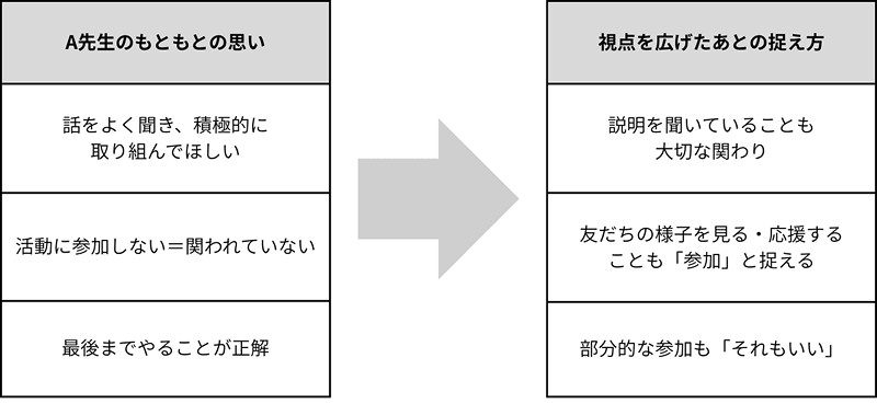 A先生から相談を受けた際、元々感じていた正しい答えから「まぁそれもいいか!」と思える子どもの行動を共に考えました。
